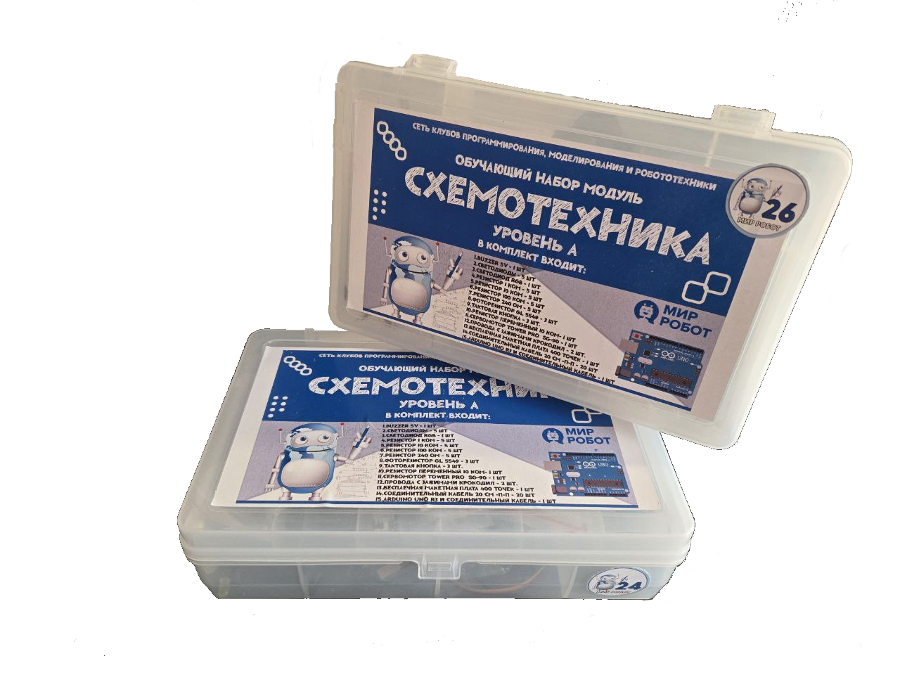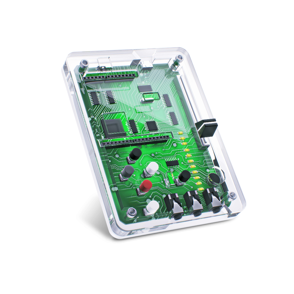 Базовая модель РоббоЛаборатории содержит: встроенные датчики света, звука. Исполнительными органами являются светодиоды и пьезодинамик. На основе базового набора датчиков можно научить лабораторию собирать и визуализировать данные из окружающего мира в реальном времени на экране ПК, мобильном устройстве, передавать команды на исполнительные органы, организовать взаимодействие с ПК в режиме игрового джойстика, а также управлять Роббоплатформой. Плата с датчиками и программируемыми сенсорами, упакованная в прочный прозрачный картридж. Ученики видят содержимое и могут разобраться в микроэлектронной части, не растеряв всех деталей
